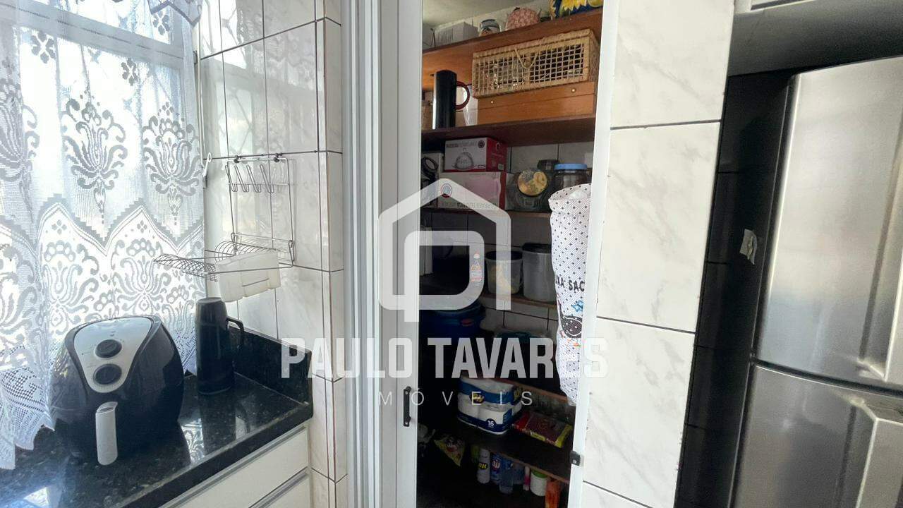 Cozinha clara e espaçosa, com armários e uma despensa;